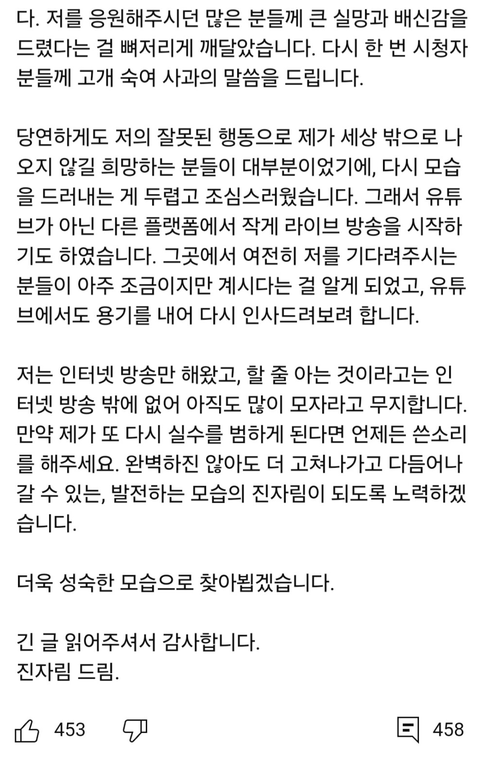 그 사건 이후로 1년동안 자숙한 척 하고 복귀함. 해명글에 작게 라이브 방송을 했다 하는데 사실 숲에서 월마다 별풍 30만개(3000만원) 받으면서 방송하고 있음ㅋㅋ 쇼츠 댓글보니까 여잼들 하는 말이 "언니 왜 이제야 돌아왔어요ㅠㅠ" "언니 잘못한 건 다 용서해줄테니까 복귀해줘서 고마워요!!!" 이러고 있음ㅋㅋㅋㅋㅋㅋㅋㅋ 진짜 대박이다...ㅋㅋ
