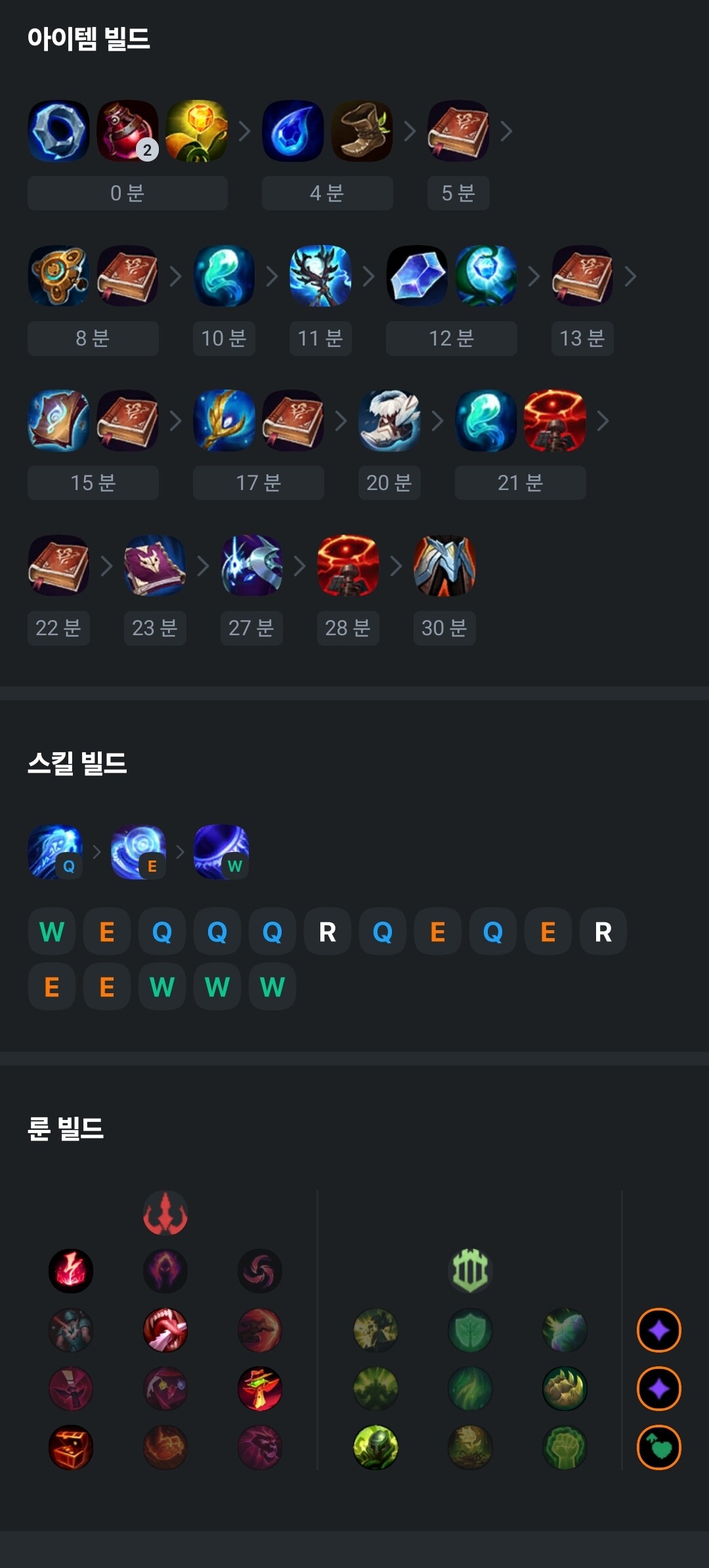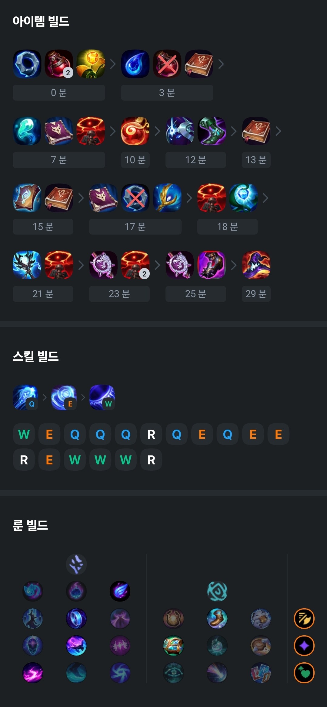 첫템 여눈 or 도란링 (초반 조금 세게) 첫귀환 여눈 or 로아템 첫템 로아 2코 대천사 3코 상황에맞춰 (존야 아니면 대부분 딜템)