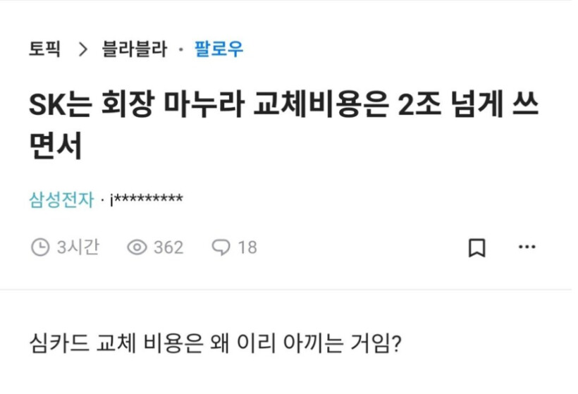 절대 마누라 교체 비용 2조 썼으면서 심카드 교체 비용은 왜 아끼냐고 농담으로라도 말하지 마셈 최태원 회장님이 이놈 하신단다