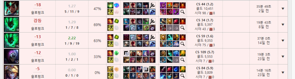 뭘 해야 이기죠? 이즈한판은 서폿이 던지고 잭스한판은 선픽으로 골라서 후픽 카운터 티모만나서 앞서고 있는데 아래 다터져서 지고 쓰레쉬 한판은 미드가 9데스 쳐 하고있고 또 한판은 트타가 줫나 앞점프 하고있고 스펠은 또 무슨 보물인거마냥 줫나 아끼고 카르마한판은 원딜이 무슨이유인지 몰라도 그냥 게임 자체를 안하고 하루종일 cs먹다가 게임끝나고