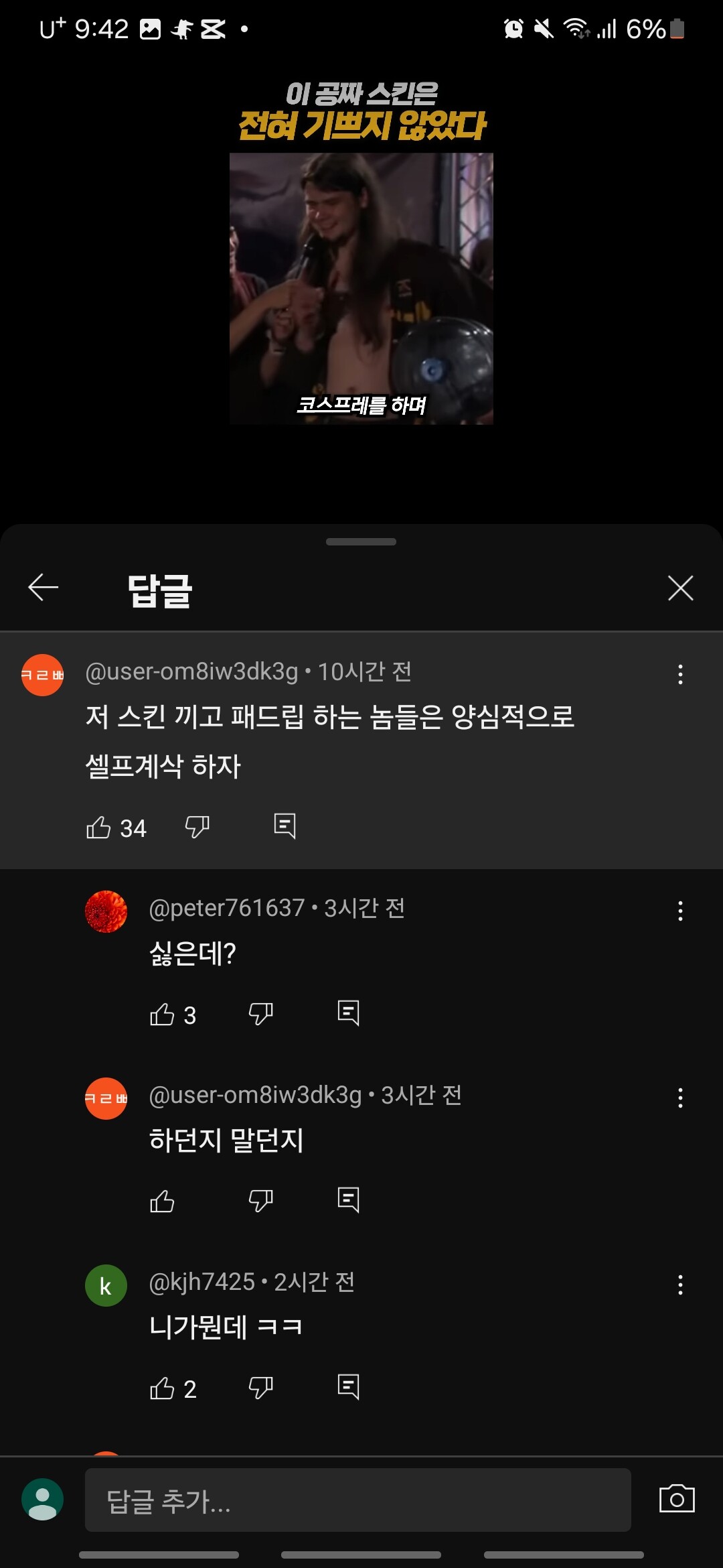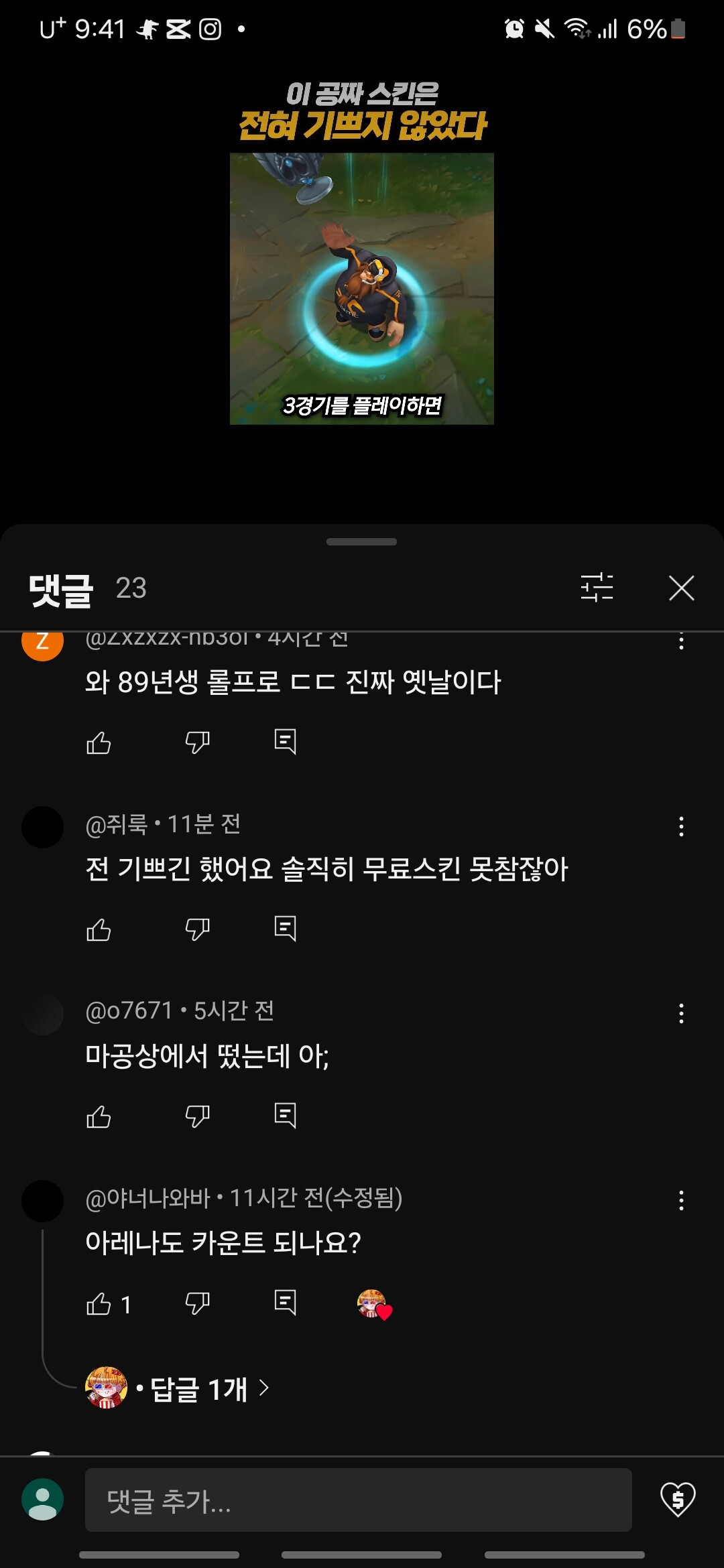 슈세이 선수 무료 스킨 영상에 달린 댓글들