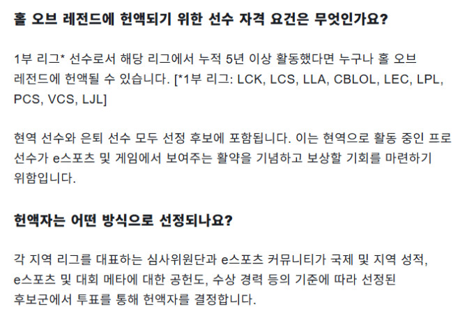 현역 은퇴자 상관없이 1부 리그에서 5년 이상 뛴 사람이면 후보 가능 헌액자 선정 방식 국제, 지역 성적 이스포츠 대회 메타에 대한 공헌도 수상 경력등의 기준에 따라 선정 -> 월즈 우승 여부와는 크게 상관없음 ㅇㅇ