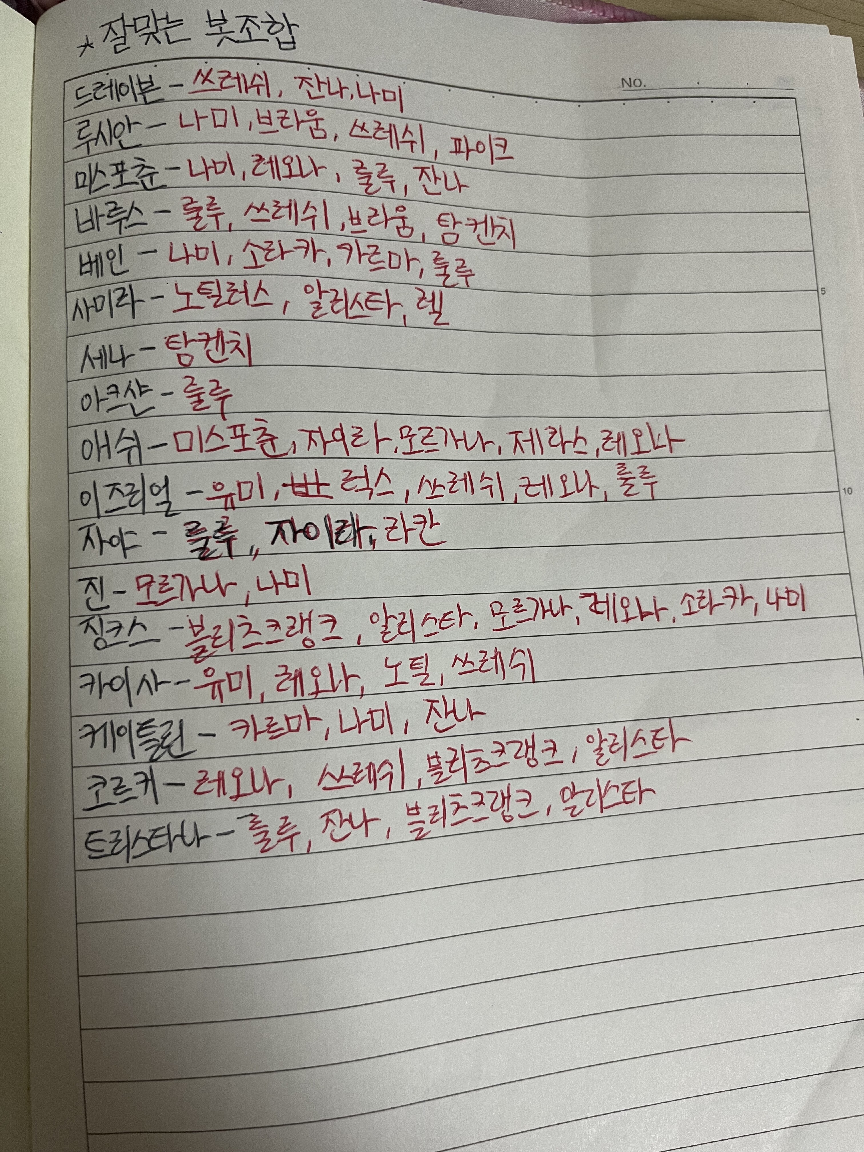 서폿으로 입문했었는데 봇 조합 뭐가 어울리는지 몰라서 인터넷에 ‘00이랑 어울리는 서폿’ 검색해서 머가 어울리는지 써둠ㅠㅋㅋㅋ 오랜만에 봤는데 추억이다