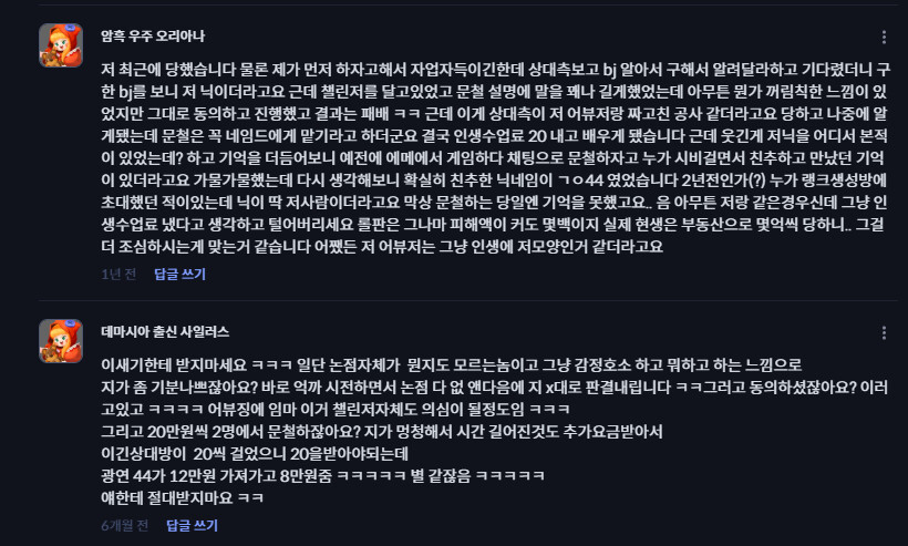브론즈부터 에메구간까지 다양하게 서식하며 짜고치는거같으니 조심하세요 이제 나이 먹어서 그런가 크게 긁히지 않은 상태로 재판 가려했던거라 이성적으로 이거 좀 이상하다 느끼고 안 당할수 있었던거 같은데 예전성격같았으면 엄청 싸우다가 결국 감정적으로 당했을거 같네요