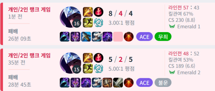 연승 좀 하니까 게임 쉽네 라고 생각하고 자만하고 있었는데 바로 팀운 참교육 당해버렸다 두판 다 조합 레전드 대체 후픽으로 왜 저런픽을 하는건지 그냥 픽창부터 질걸 알고 있었는데 최대한 노력해봤건만 예상대로 가버렸다