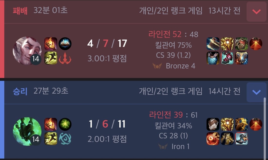 어제 7시간 정도 배치 5판에 솔랭 플레이 해봤음 원딜 포지션 해보고 싶어서 돌렸더니 자꾸 부포지션 걸리길래 (원딜하는 사람 많아서 매칭 7분넘게 걸림) 포기하고 그냥 하던대로 원딜 포기하고 서폿 정글로 돌림 이기기가 하늘의 별따기…