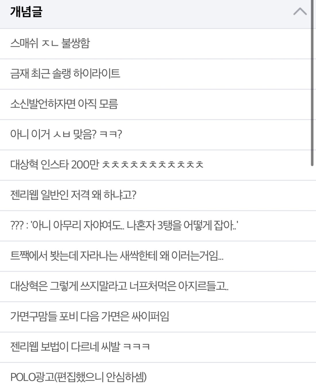 좀 그렇더라 .. 티원응원갤러리 느낌이라기 보단 스매쉬응원 갤 혹은 구마유시 안티 갤 느낌이 강하게 듦….