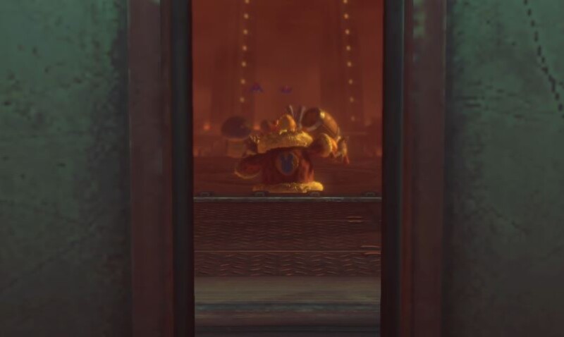 적 떼거리가 쫓아오자 부하들, 커비와 함께 엘레베이터로 탈출을 시도하다