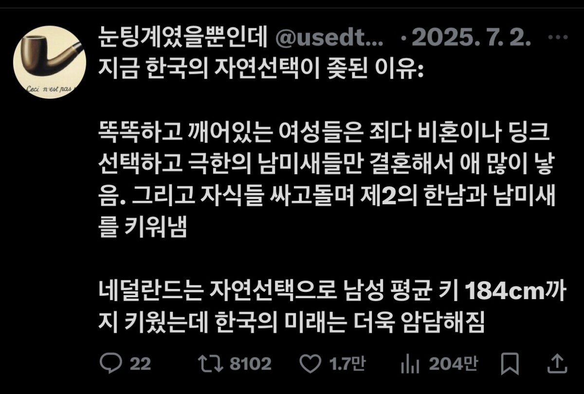 한국의 자연선택이 ㅈ됬다는 트위터인