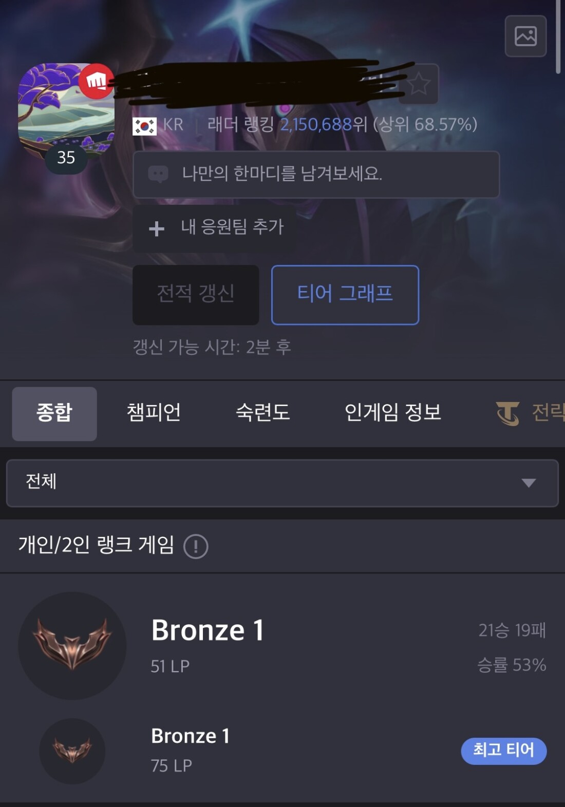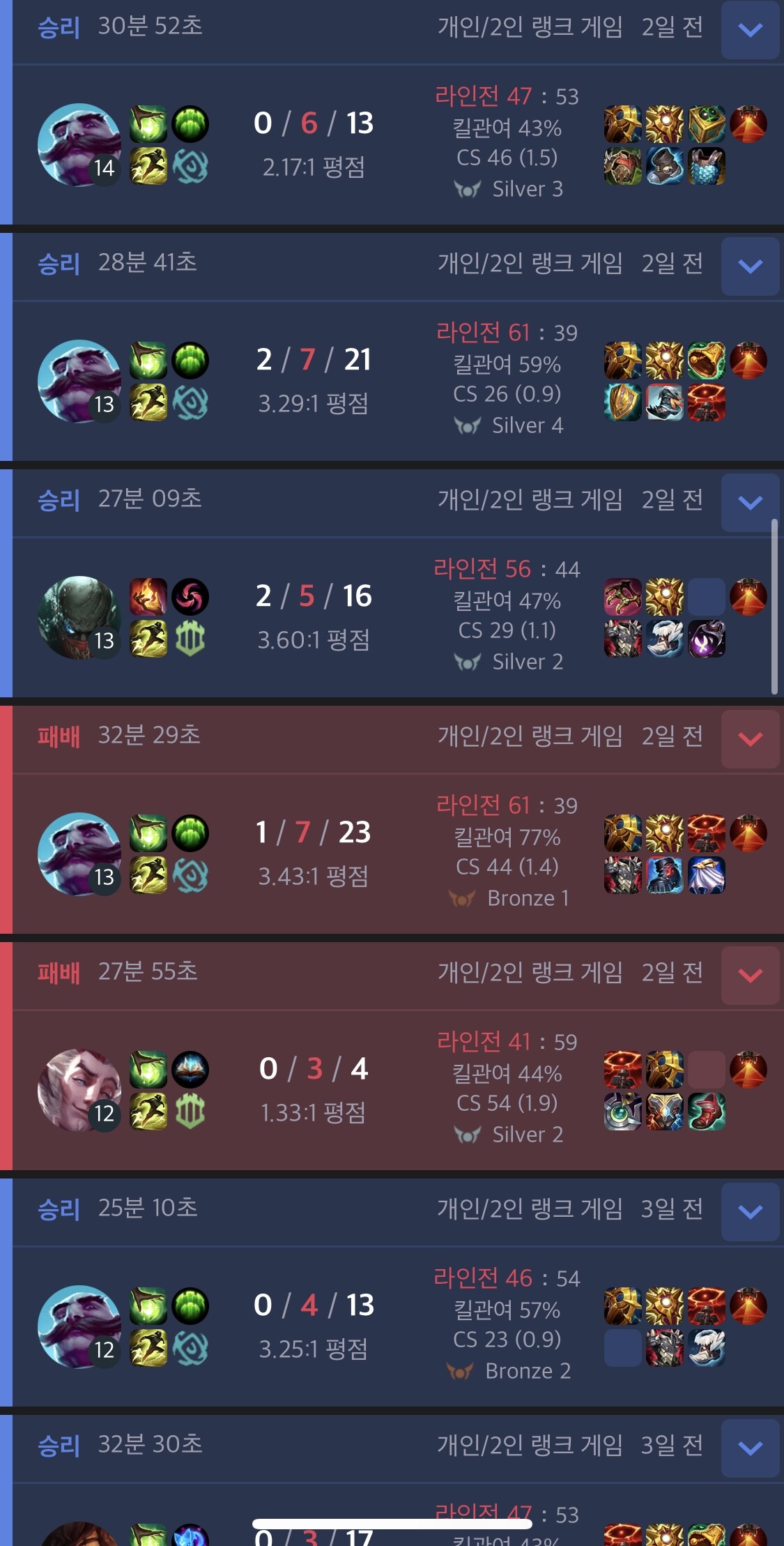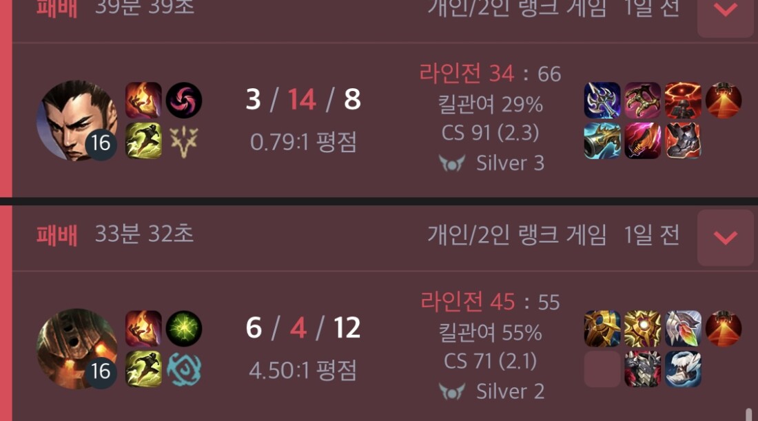 브론즈1 75점 까지 올렸다가 신짜오 서폿한테 탈탈 털리고 게임 져서 실버 승급못하고 멘탈 나가서는 다음 게임 신짜오 서폿해서 욕 쳐박고 겜 또 지고 징징거리다가 팀원한테 욕이란 욕은 다 먹고 신고까지 당해서 7일+3일 채팅금지에 명예 5레벨 다 날아가고 일반게임 3회 승리 패널티까지 생김 :D