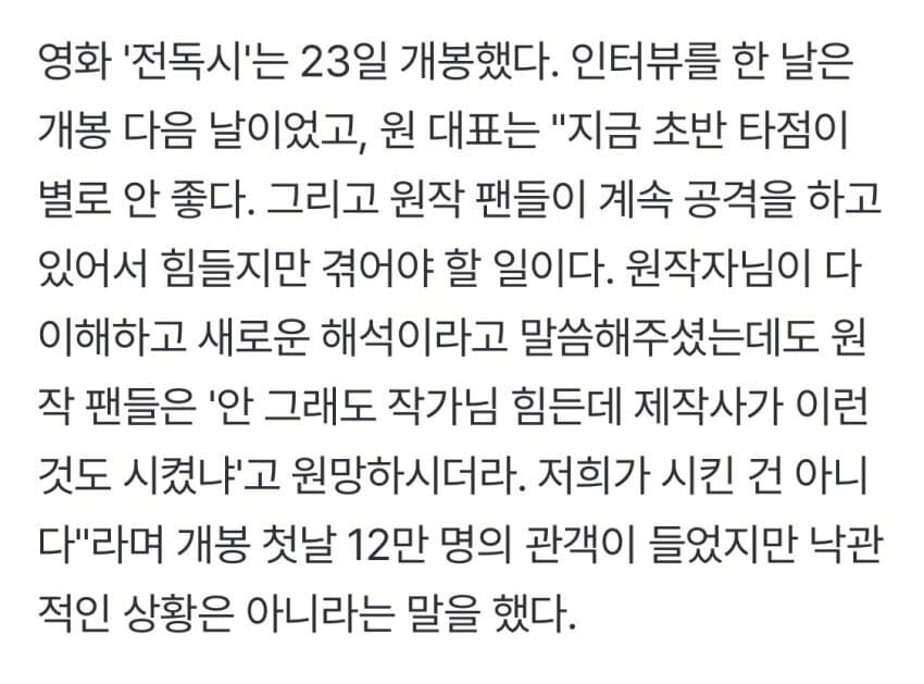비슷한 시기에 개봉한 네이버웹툰 원작인 '좀비딸'은 각색된 부분은 호불호 갈려도 일단 호평이 많은거 보면 이젠 누구탓을 하려나