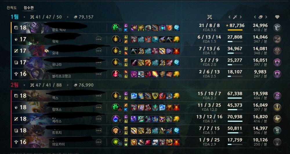 이겨주기 싫게 못한다 같은 감정은 느껴봤어도 25분에 4코어 띄우고 사이드 3차 다 민 문도한테 2코어도 못 뽑고 정치박는건 신기하네
