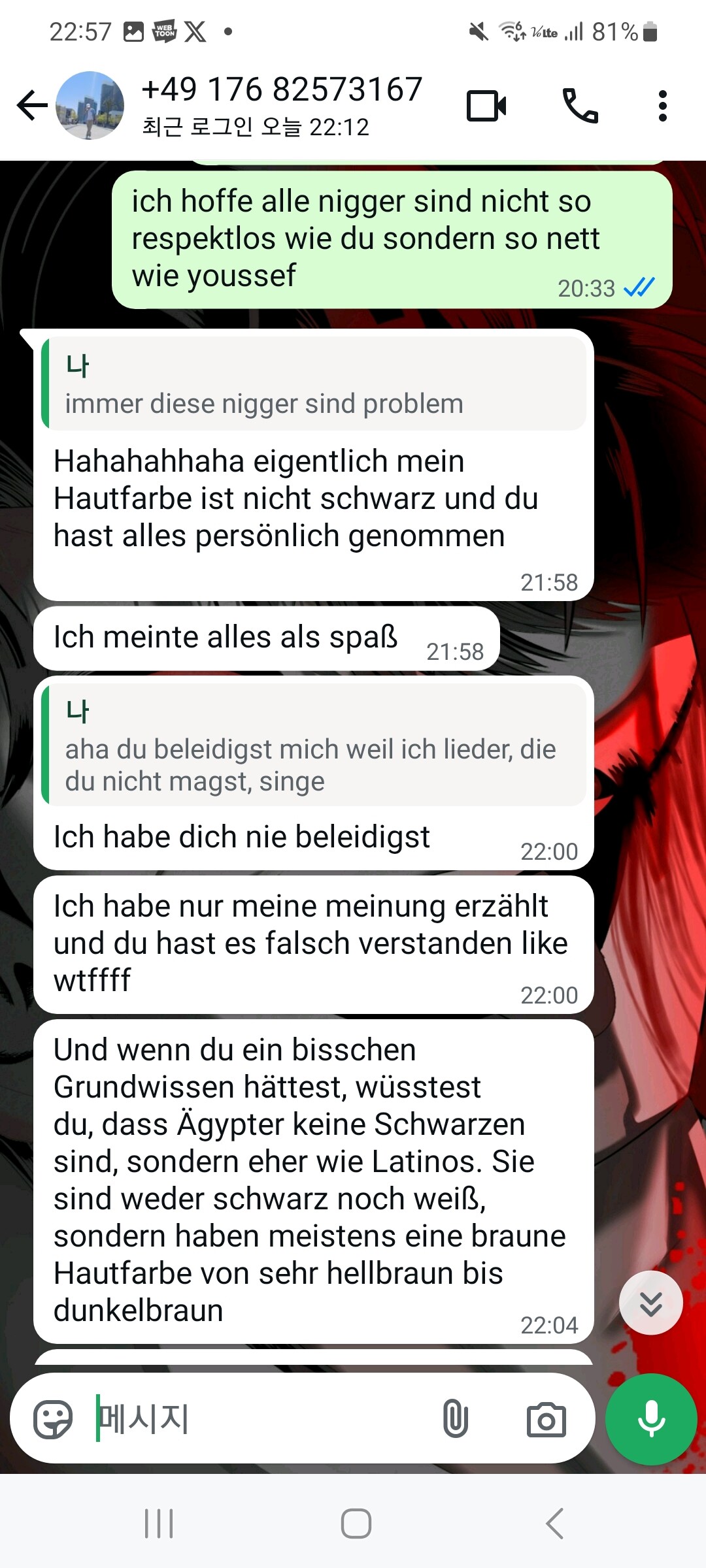 근데 이 년이 갑자기 나한테 노래는 또 왜 그딴 병신같은거를 부르냐고 지랄발광함 내가 여기서 깨달은게 이 년은 병신이구나임 내가 여기서 부른 노래가 궁금할텐데 Warriors, GODS, Speechless, Breaking the Habit 임 GODS는 뉴진스가 내가 부른 노래들의 원곡자들에 비해서 체급이 작으니깐 모르고 이상하다 칠 수 있는데 솔직히 나머지 3개는 체급이 경의로운 수준이잖음 근데 얘는 이 노래들을 모른다고 말하고, 이딴걸 누가 좋아하냐고 말함. 이 때 개빡쳐서 딜교 시작함
