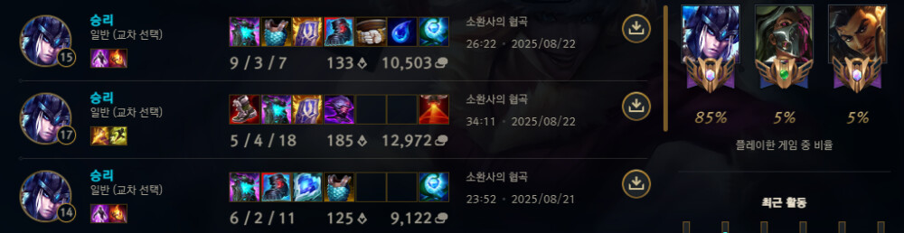 이거 말고 더 있지만 일렬로 예쁘게 찍힌건 이거 뿐이라 이거만 올립니다 일단 체력이 부족하다고 탱킹이 안돤다는 체감은 잘 안느껴졌습니다 또한 방마저가 한타 페이지에서 미치도록 높아서 중반타이밍에 적이 세주를 잡는데 크게 애를 먹기도 했죠. 그렇기에 내일중으로 이 빌드를 실전 랭겜에서 테스트해볼 생각입니다. 테스트 결과가 만족스러우면 빌드를 재데로 정립해보겠습니다.