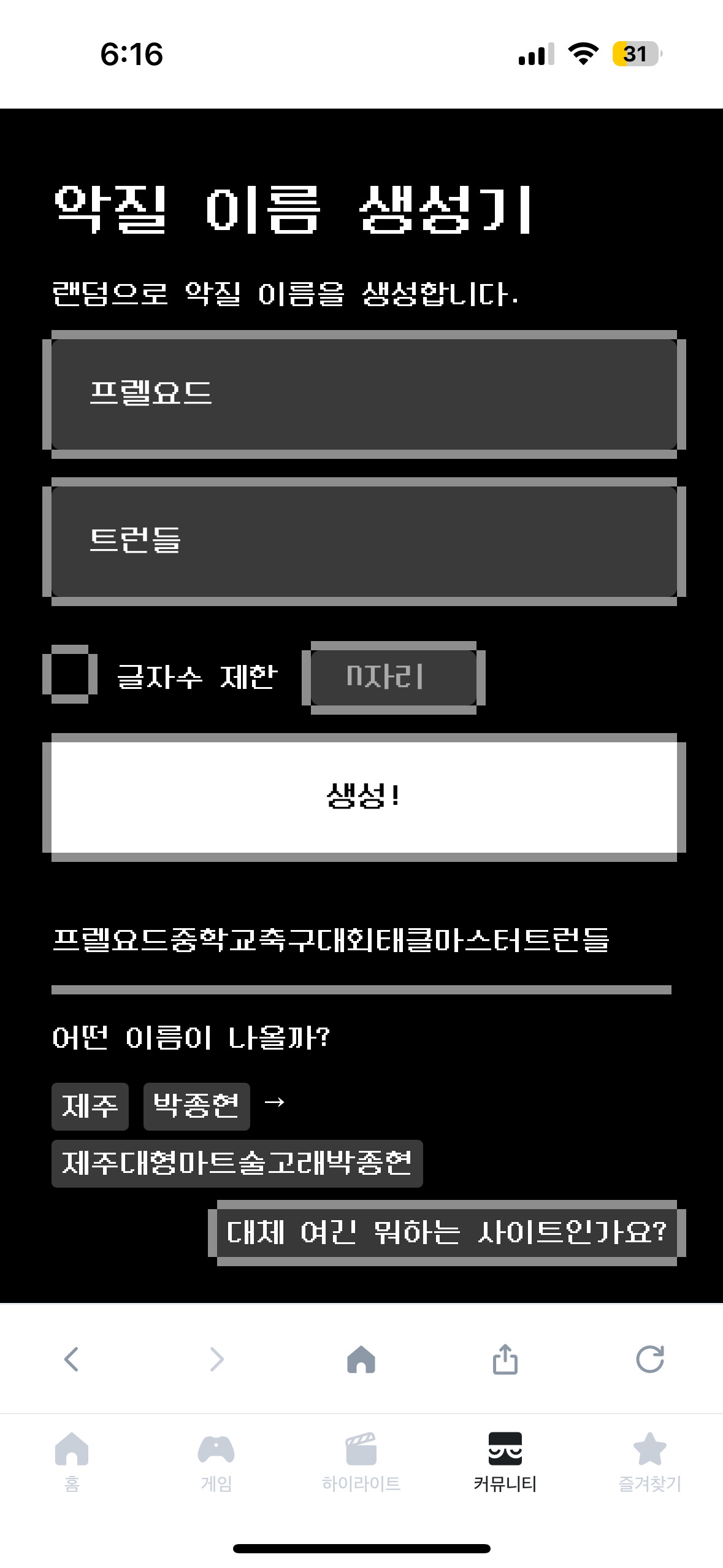 악질 이름 생성기 오랜만에 하니까 재밌네 ㅋㅋ