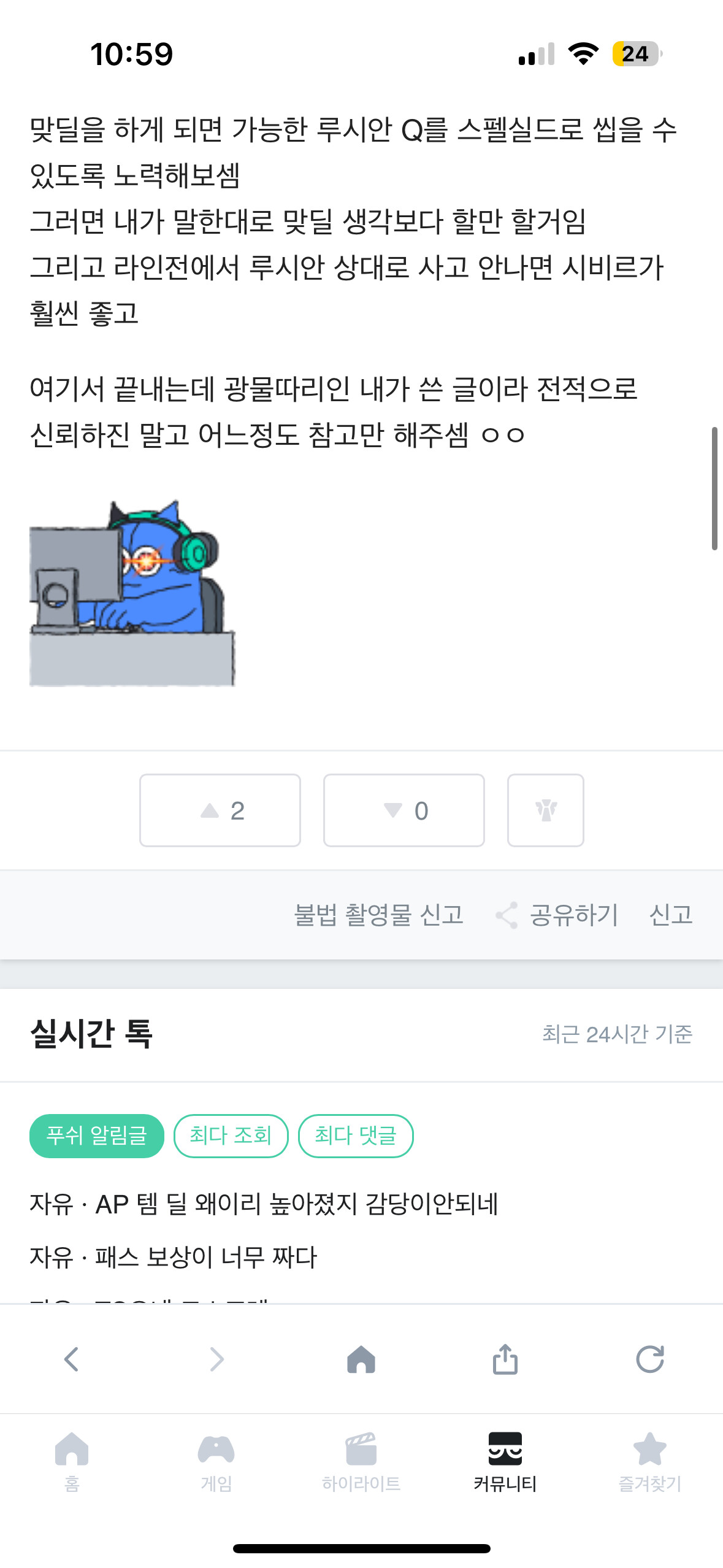 일단 갈햄이 좋아하는 롤 주제로 글을 썼음 현재 작성한지 20분 조금 넘은 글이고 추천수는 2개 몇시간 뒤에 다시 확인해보긴 할거고 추천수가 크게 변화가 없을거라고 예상하고 있음 그리고 잤다가 일어나서 봤을 때 갑자기 조회수랑 추천수가 뻥튀기됐다면 분명 갈햄이 주작친걸거야 몸은 작아졌어도(?) 두뇌는 그대로 미궁을 모르는 명탐정 진실은 언제나 하나! 갈햄 당신의 주작을 내가 반드시 밝혀내겠어!