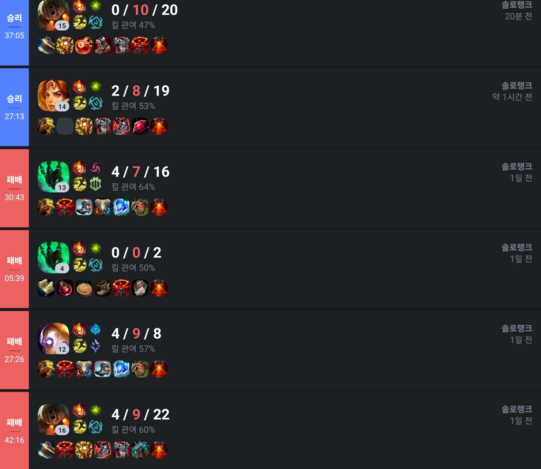 서폿이 KDA좀 괜찮고 킬쳐먹으면짐 그리고 정글 시발놈들 카정이나 바위게 싸움까지 서폿이 턴잡아주고 하나하나 다해주고 안될땐 서폿이 욕처먹으면이기고 라이너 새끼들 욕처먹고 꼬롬한판은 짐 ㅅㅂ..