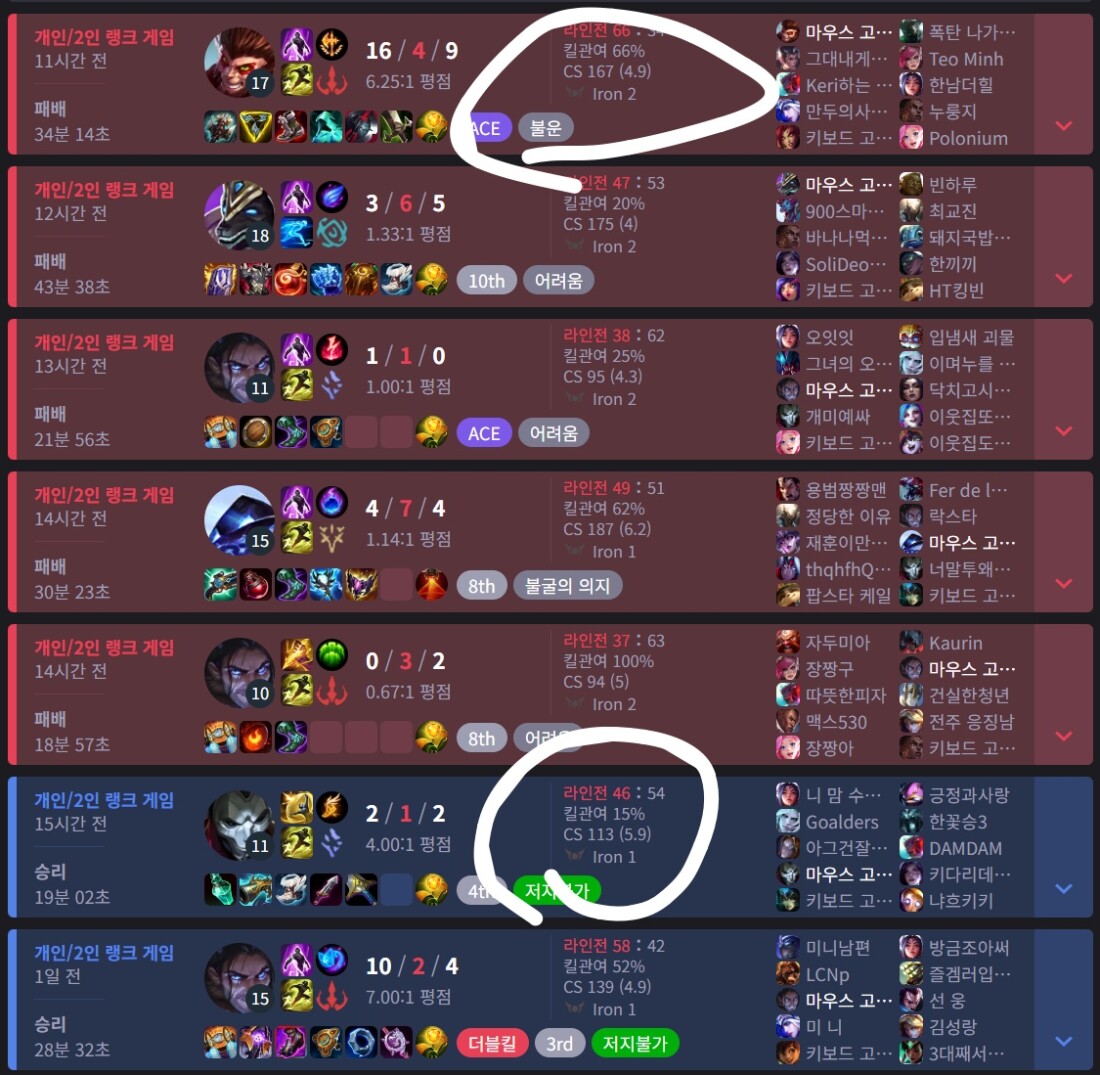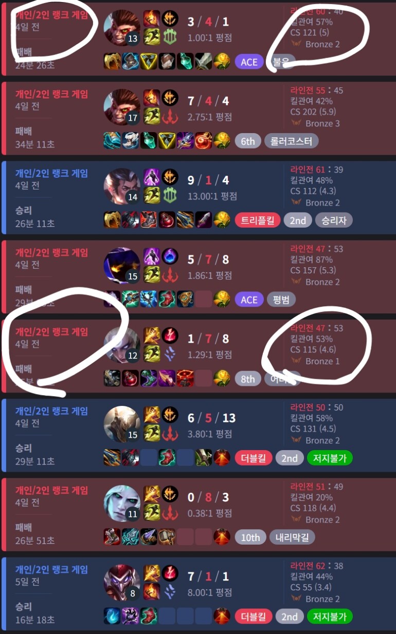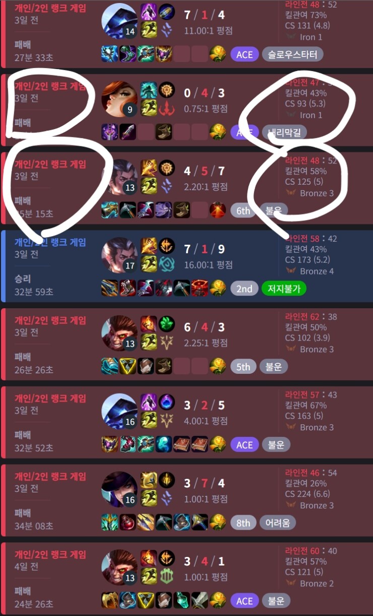 일단 저는 듀오로 돌리고있고 브1,브2 였는데 지금 브4 아2됌 4일전에 브1을 찍고 지금 브4까지 떨어졌는데 4일동안 연패를 거의 16판정도 한거 같습니다 중간에 1 2판이긴적은 있어요