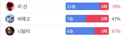챔피언이 불합리하다 나 원래 리신 개못해서 리신 고정밴하는데 요즘 사일 짜증나서 사일 밴하니까 리신 계속 나오길래 나올때마다 너무 세보여서 내가 해봤더니 리신 숙련도 ㄹㅇ 니달리 숙련도 반의 반도 안되는데 니달리보다 승률이 더 잘나옴 걍 개사기챔 난 리신보다 비에고를 더 잘하는데 비에고는 5할도 안나옴