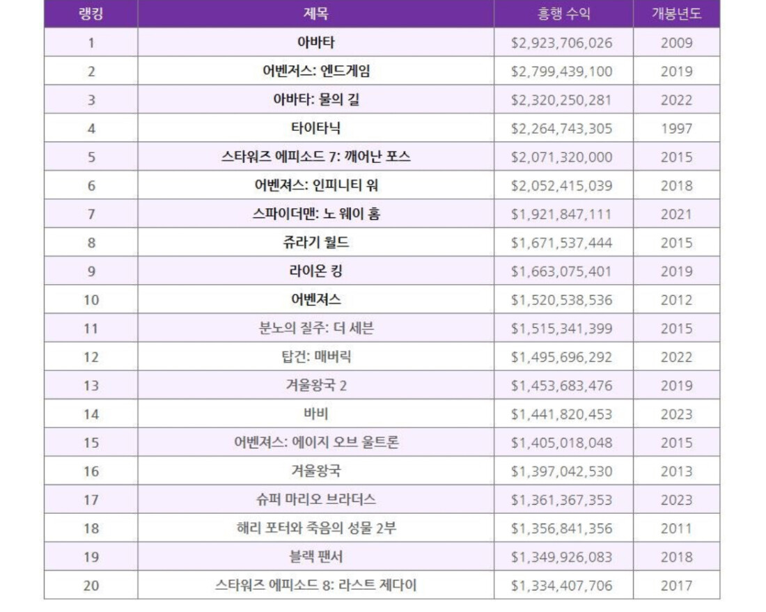 전 세계 역대 수익이 가장 많은 영화 1위~20위 랭킹인데 신기한 공통점을 찾았음