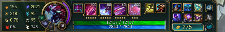 체력 12,000, 주문력 2,021, 방마저 218에 95인 챔피언이 침묵, 체력스텍, 슬로우 있고요. 에어본 있고, 심지어 쿨타임은 4초고 마나는 100달고 심지어 궁쓰면 고정딜에다가 최대체력 증가하고요 그 다음에 체력을 올리면 올릴수록 주문력이 생기고! 궁에 딜이 증가하고 궁에 체력계수가 있어서 그 고정딜이 그 으아아아아악