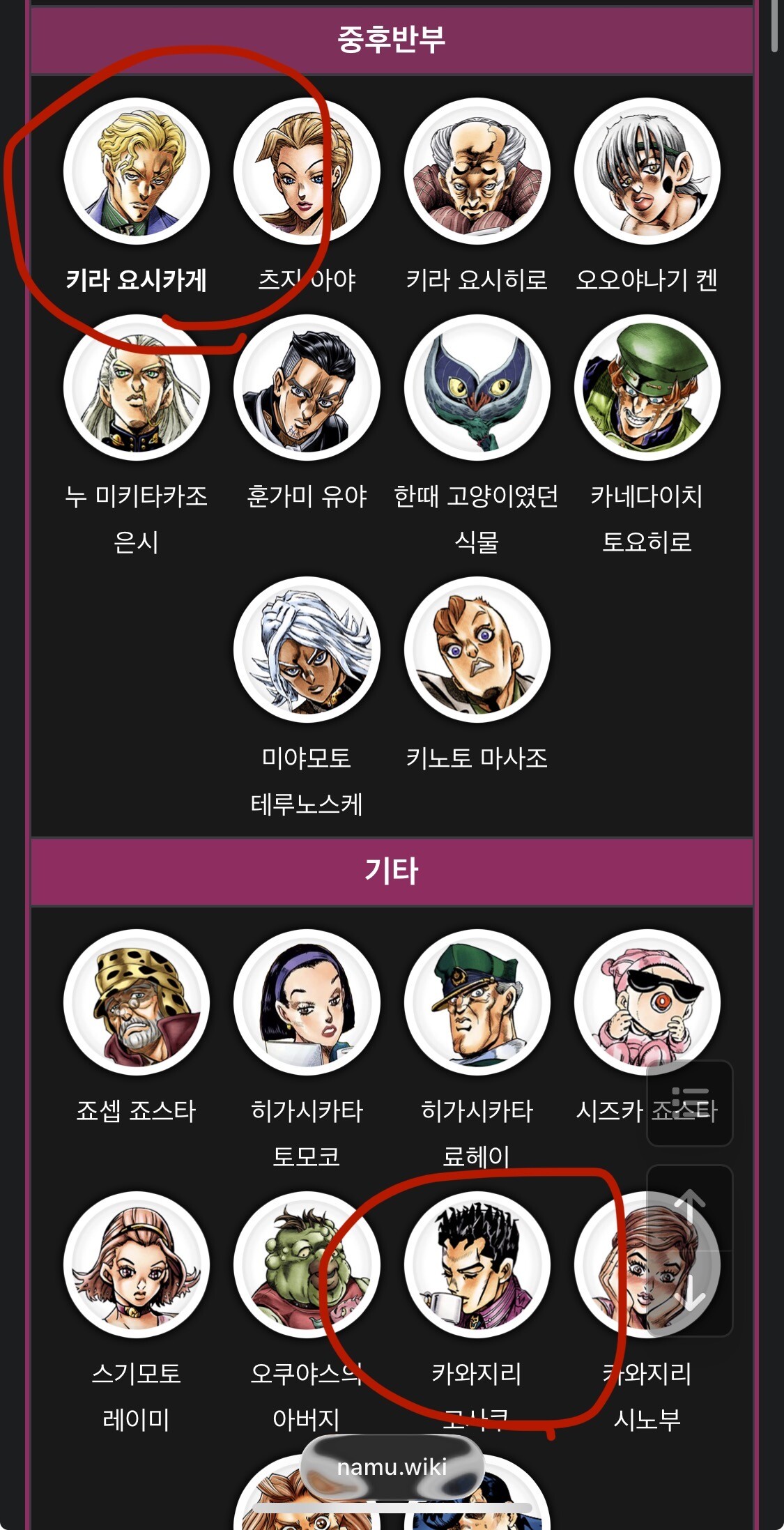 카와지리 코사쿠와 키라 요시카게가 등장인물란이 따로 있음을 알수 있다.