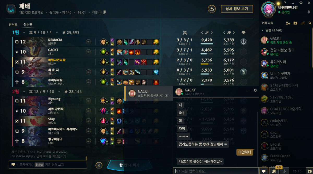 무지성 카정하다가 탑 정글 미드한테 린치 당해 죽었는데 갑자기 미드 달리더라 승률 50%만들기 위해서 ai같은거라도 만든 줄 알았는데 사람이었네ㅋㅋ 어차피 게임은 나보다 못하는 녀석이라 그냥 웃기기만 했음 저런 애들도 맵리 타령하는거 보면 어디서 들은건 있어서 아는대로 내뱉는거 같은데 무슨 뜻인지 알고 쓰는건지 궁금한데 이거 보면 댓글 좀 달아라