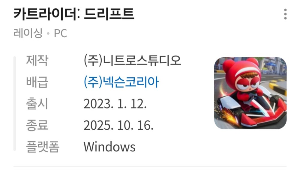 오늘 아침 9시에 가셨습니다. 지금 누군가의 컴퓨터에는 플레이 불가능한 카트라이더 두개가 있다는 소문이...