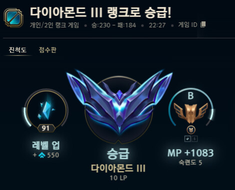 해서 다이아 3 옴 4년 전쯤 백수일 때 다이아 가보겠다고 눈 뜨면 바로 컴 키고 졸리고 지칠 때까지하다 자고를 몇개월 동안 반복하고 잘 안 되면 엉엉 울면서 500판씩 박고 겨우 0점에 주차 두개 시켜 놓은 적이 있었는데 다3은 진짜 다이아 같아서 기분이 좋네 게임 재능이 진짜 1도 없는 사람이라 고딩때 시작해서 브론즈로 1년 실버로 1년 골드로 4년 있던 ㄹㅇ광물인데 하면 되는구나 기입법 덕분인가 아무튼 다들 채팅 끄고 열심히 하자 매칭 주작 말 많아도 그걸 역으로 써먹으면 되는그야 마스터 도저언