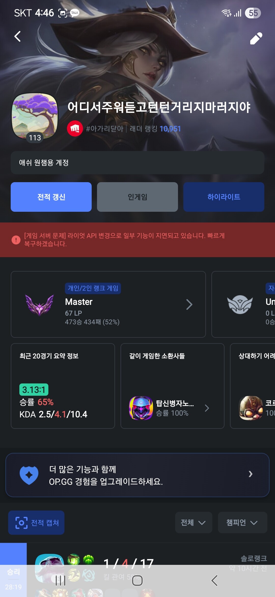 하다가 야간 알바하고 와서 피곤하기도 하고 마우스질 하기 귀찮아서 주라인가서 계속 이기긴했는데