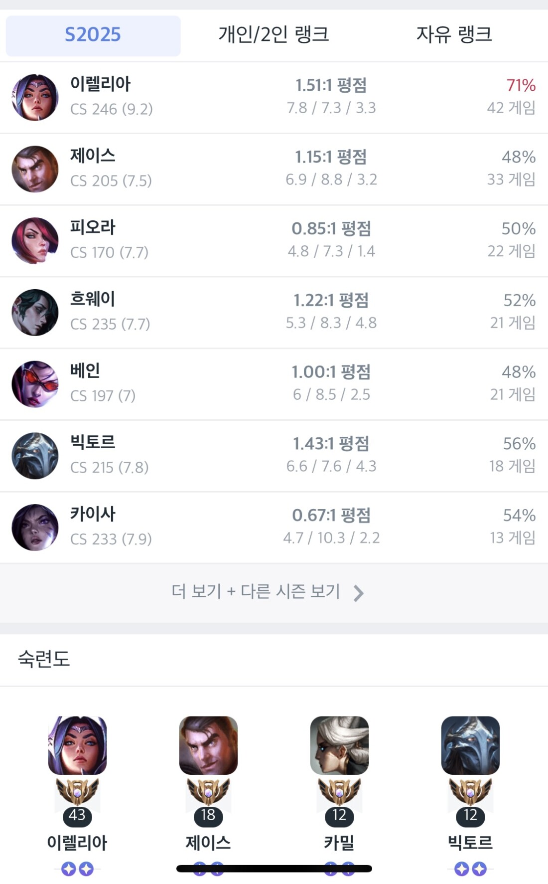 어느 시즌이나 대충 이런 승률, kda뽑힘 제이스 라이즈 정도는 그래도 숙련도 있다 생각하는데 걍 다른 챔프들은 다 고만고만하게 50% + - 4% 승률인데 이렐만 높음 그렇다고 상대 뻔히 이렐 극 카운터라 얘가 병신이 아니고서야 게임 내내 고통받을게 뻔한데도 이렐 뽑거나 선픽 이렐 나가긴 싫은데 어찌해야할지 모르겠다