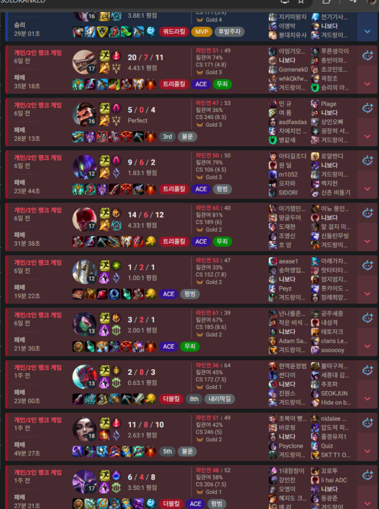 이긴판은 대부분 MVP고 진판도 대부분 ACE 띄우면서 팀이 던지더라도 페이스 유지하면서 상수로 잘해줌 저 요네판은 바텀 정글이 던져서 미드 108갱 당한거니깐 이해해주셈