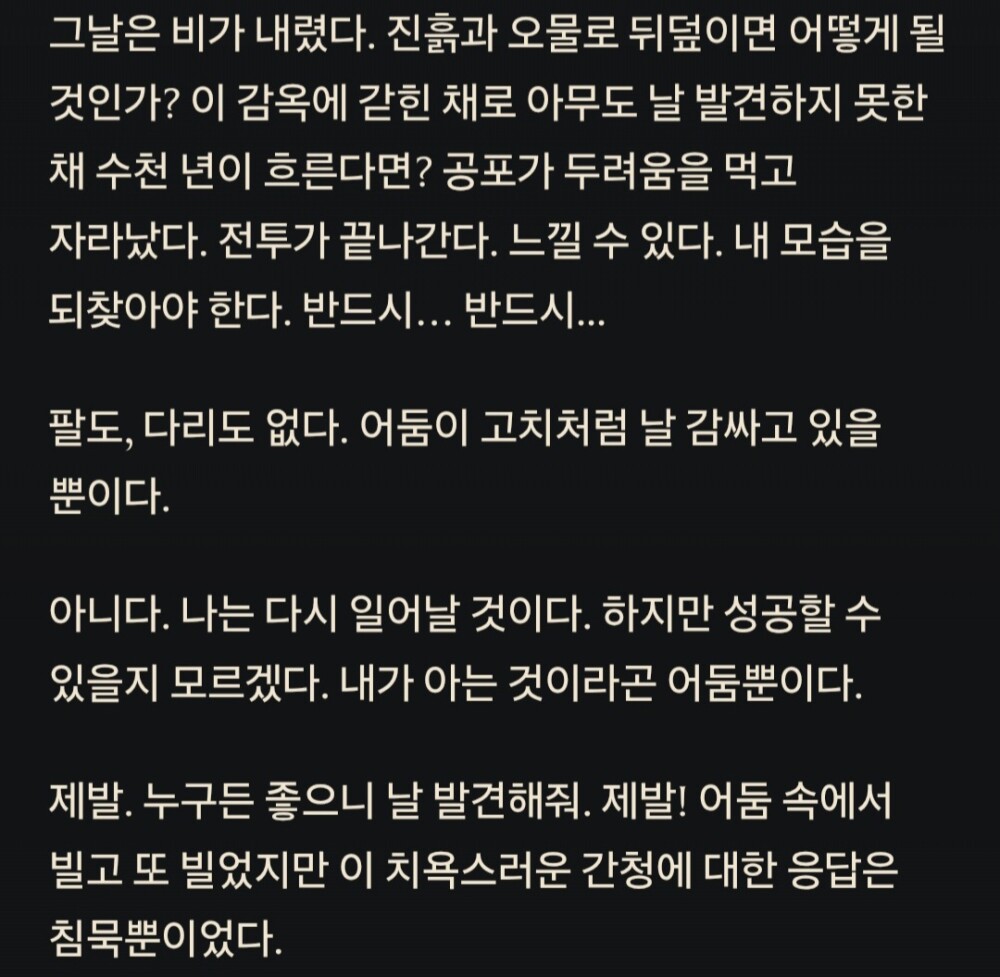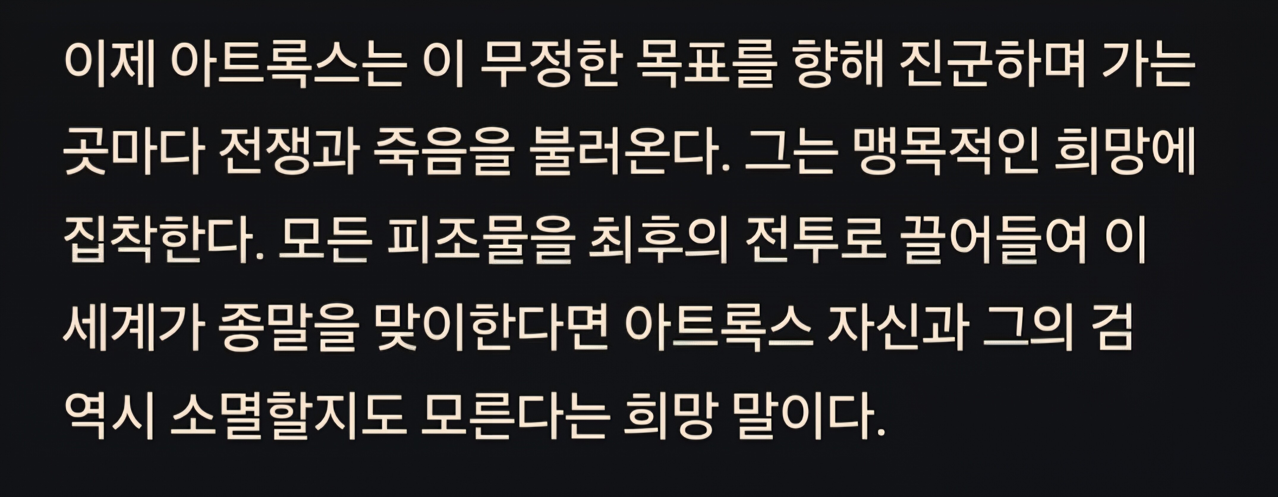 대충 봉인된 복수심+파괴욕으로 세상 멸망시키는 내로남불인 줄 알았는데 죽고 싶은데 불멸이네. 걍 다 죽자 인게 신기했음 이 묘사 봉인당했을 때 숨 못쉬니까 질식하는 고통 계속 느낀거라던데 악당 맞는데 생각보다 공포도 느끼고 좀 불쌍함 전쟁 ptsd로 타락+봉인당했고 ㄹㅇ 복수심으로 파괴하려는 다른 다르킨이랑 다르게 지 소멸하는게 목표임