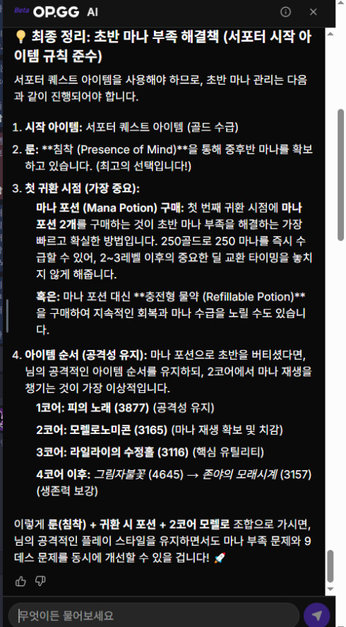 서포터 아이템 얘기하고 있는데 강철어깨보호대로 시작하느니 마나 재생을 갈려면 모렐로노미콘을 가야하니 라인전에서 마나 포션을 구입하면 된다드니