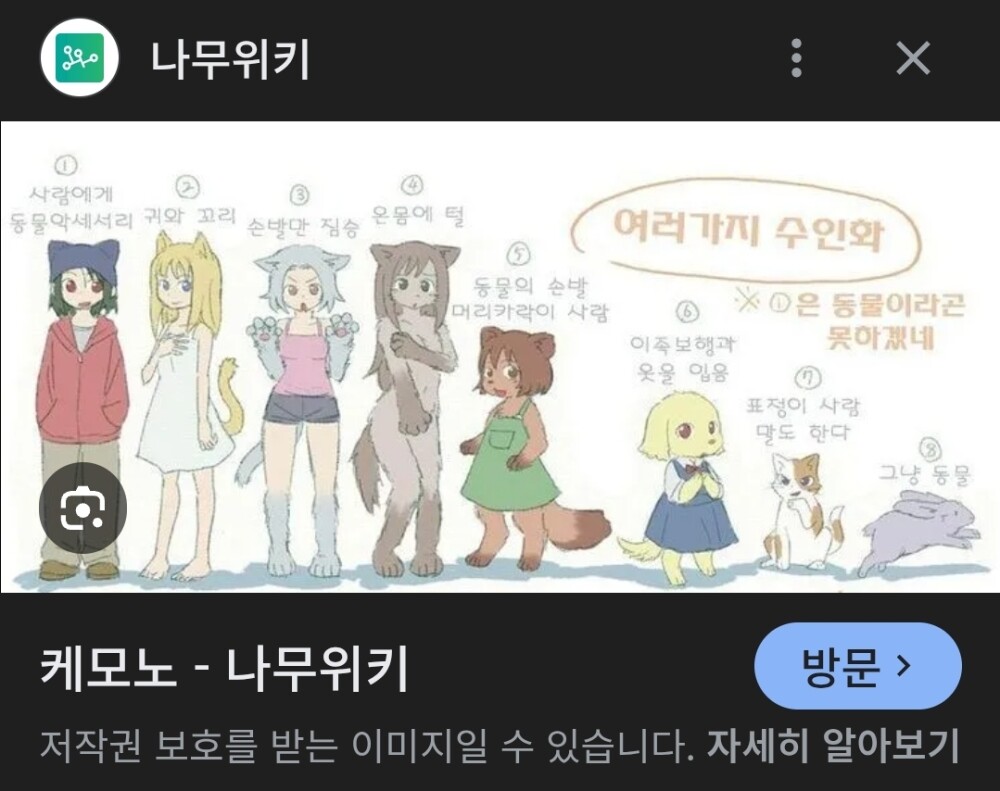 만약에 갑자기 지구에 뭔 이상한 외계인이 나타나서 이상한 광선을 쏘니 지구 인구 70%가 사람이랑 동물이 섞여버림. 이쪽 세계에서는 연애에 성공한 당신이 결혼까지 약속한 상대방이 동물화가 진행중인데 막을수 있다고 함. 근데 연인이 님이 원하는 단계일때 약을 먹여달라고 함. 몇단계에서 멈출거임? (1->8순서) 난 5~8빼고 다 가능