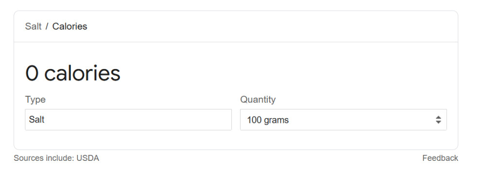 소금의 칼로리는 0으로 설렁 한포대를 먹는다 해도 절대로 살이 안찜 오히려 다이어트를 하거나 건강관리를 할떄 소금 섭취를 안하면 현기증이랑 체력저하등을 일으켜 오히려 건강에 안좋은 영향을 끼치게 됨