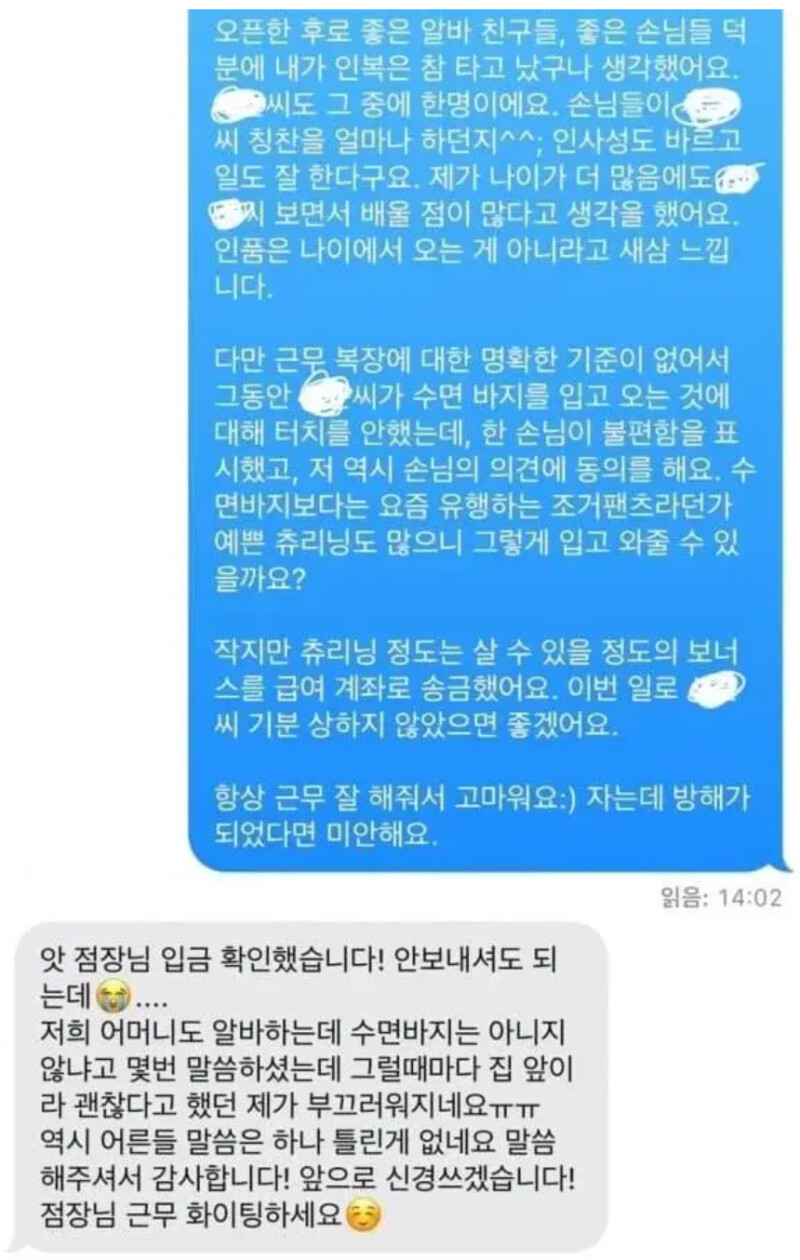 수면바지 입고 일하는 알바한테 문자보낸 사장님