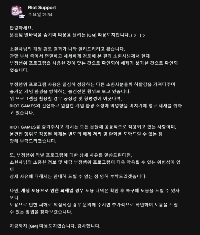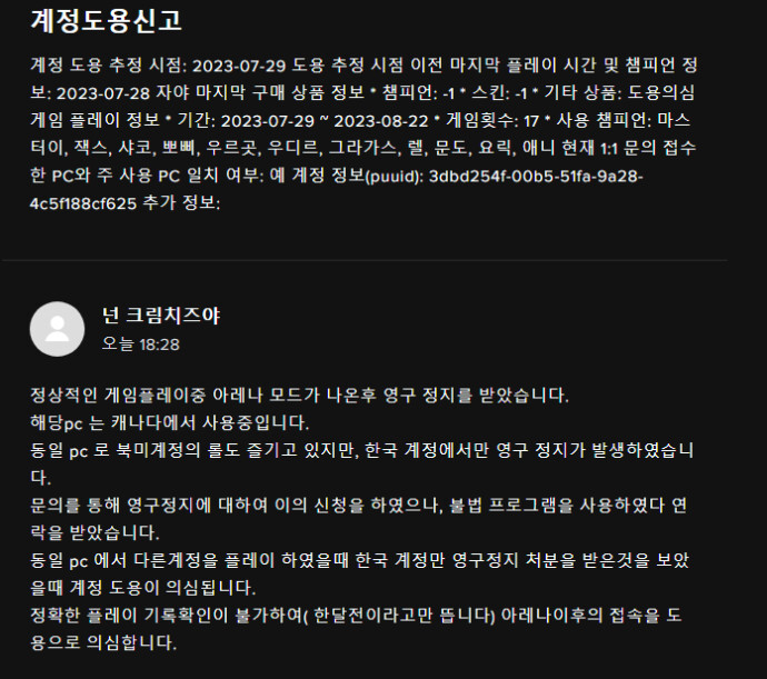 닉변 안된거 보면 계정 도용이 아닌 무고벤했던걸 푼거 같은데 그럼 지들이 말한 불법 프로그램 사용은 뭐일지 정말 궁금함 라코 일처리 진짜 거지같음