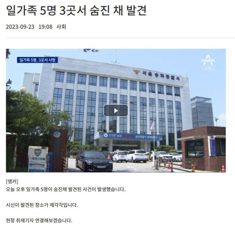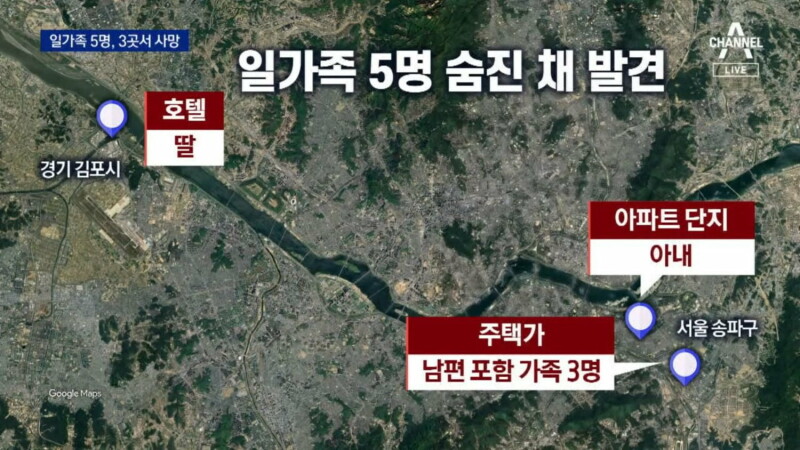 1. 엄마 아파트 에서 추락해서 사망 해서 가족들에게 알려주기 위해 경찰이 집으로 갔으나 2. 할머니 아빠 고모 서울 다른 집에서 사망 한채로 발견되어 엄마의 마지막 행적을 살펴보니 3. 딸 호텔에서 사망 한채로 발견됨.