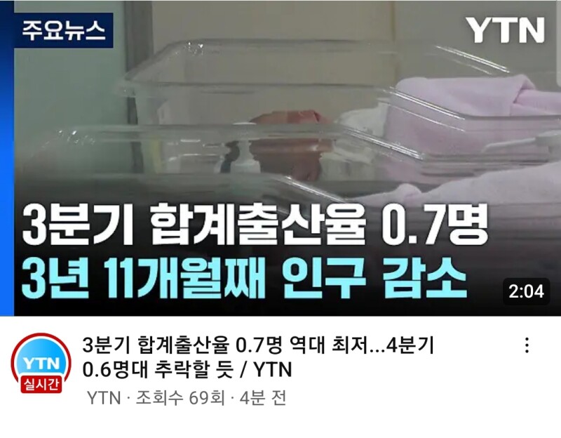 참고 : 인구가 그대로 유지되는 출산율은 2.1이다. 한국은 그것의 1/3이다.