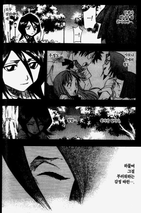 첫만남 안 좋았는데 통성명 하면서 목숨 서로에게 맞기는 뽕맛전개 이별을 슬퍼하면서도 위험해서 구해주려고 도움을 거부하는 히로인 무브 거의 대놓고 연애감정 묘사 자기 감정 죽여야 한다는 걸 알면서도 구해주러 온 것에 고마워하는 감정이 저절로 넘쳐버리는 장면들 사진은 못 구했는데 루키아 구해주러 왔을 때 이치고 패션을 풀브링거 편에서 이치고 구해주러 온 루키아가 똑같이 입고 와서 구원해주는 개쩌는 수미상관 자신이 존경했고 소중했던 사람이 주인공이랑 성격은 안 닮았지만 심지가 똑 빼닮았다고 지속해서 언급 아란칼 편 끝나고 이별할 때 아련 그 자체인 눈빛과 연출