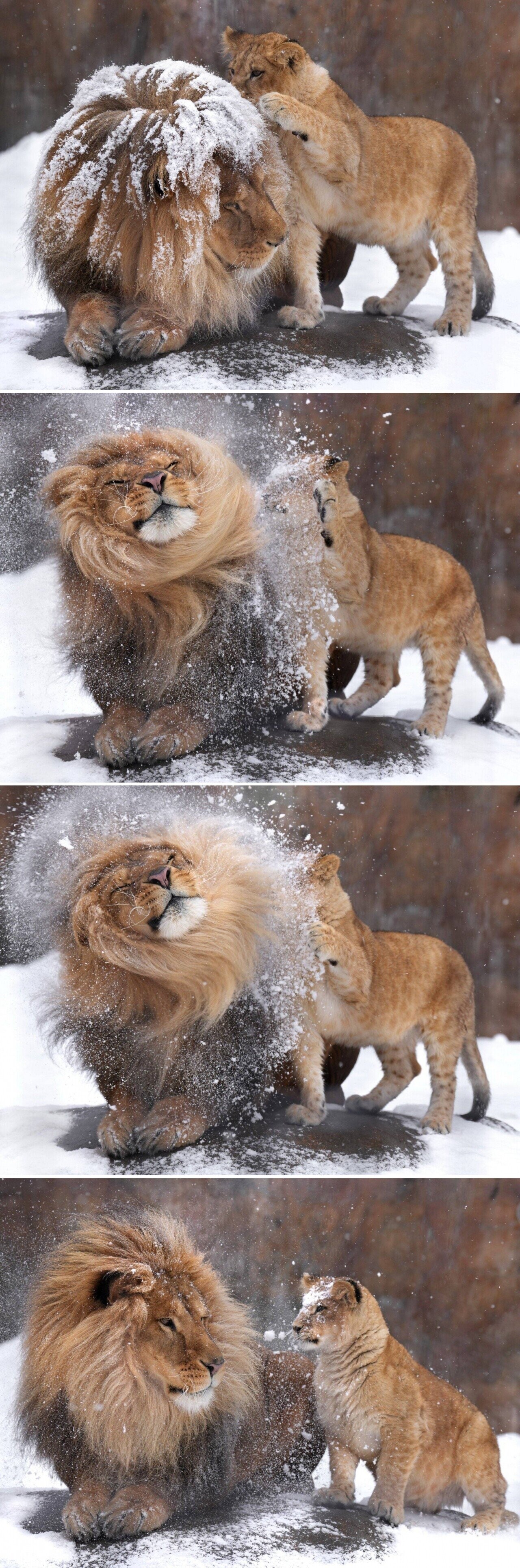 아빠 머리에 쌓인 눈을 털어주려던 아기사자