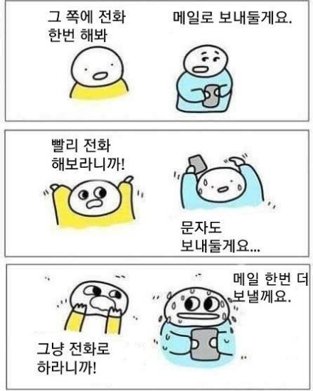 전화로 1분이면 되는거 메신저나 메일 고집하는 직원들 있음.. 나중에 친해져서 왜 그런가 물어보면 전화로 의사소통하는게 부담스럽다고..