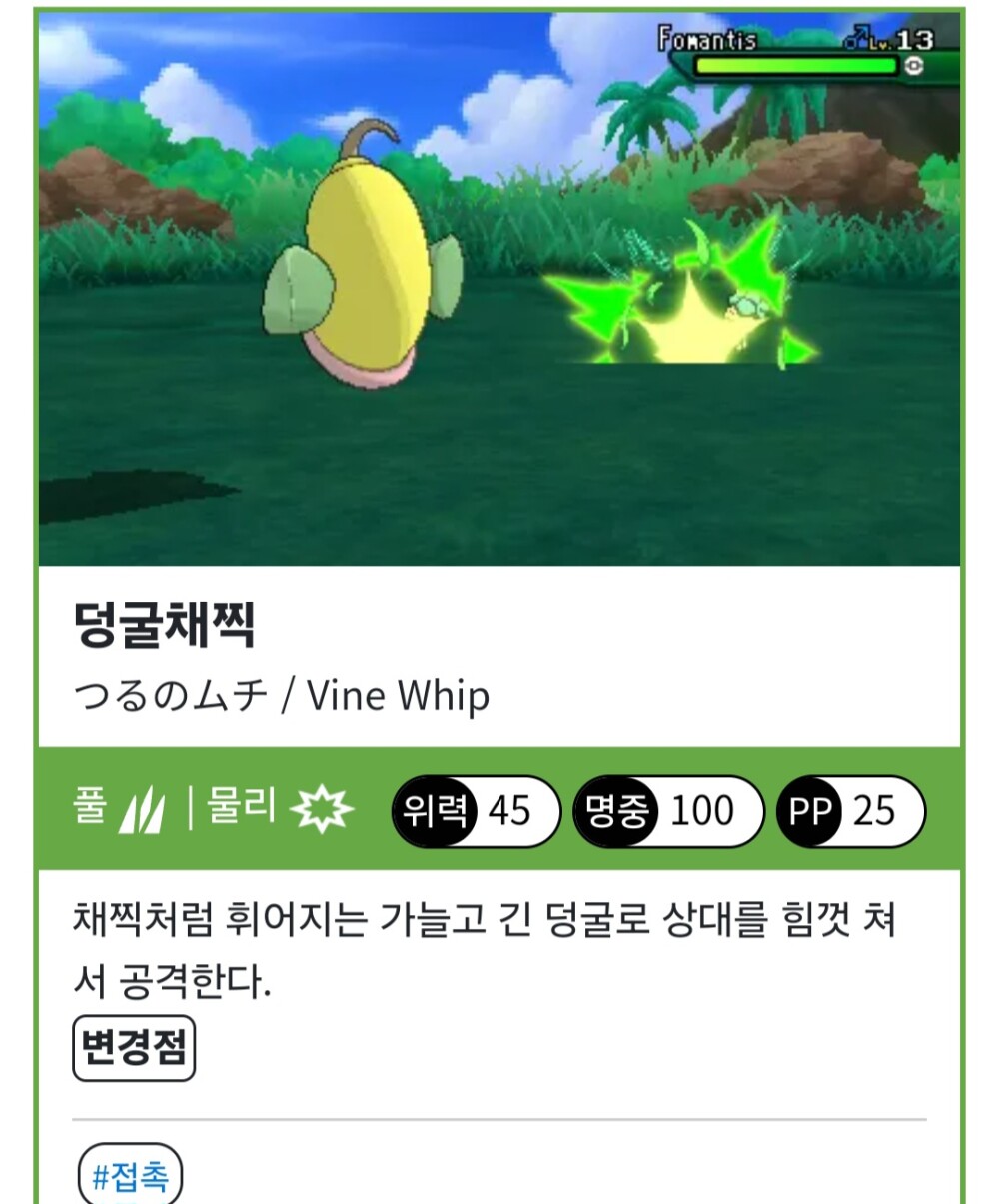 ​ 정확히는 부모에게서 물려받는 "유전기"의 형식으로 배울 수는 있다. 근데 이를 위해서는 덩굴채찍을 배운 다른 수컷 포켓몬과 암컷 치코리타(혹은 그 진화형)을 교배해야 하는데, 보다싶이 덩굴채찍의 위력은 고작 45에 아무런 부가효과도 없어서 그정도의 수고를 들여 유전시키기엔 가성비가 안나온다 ㅋㅋ