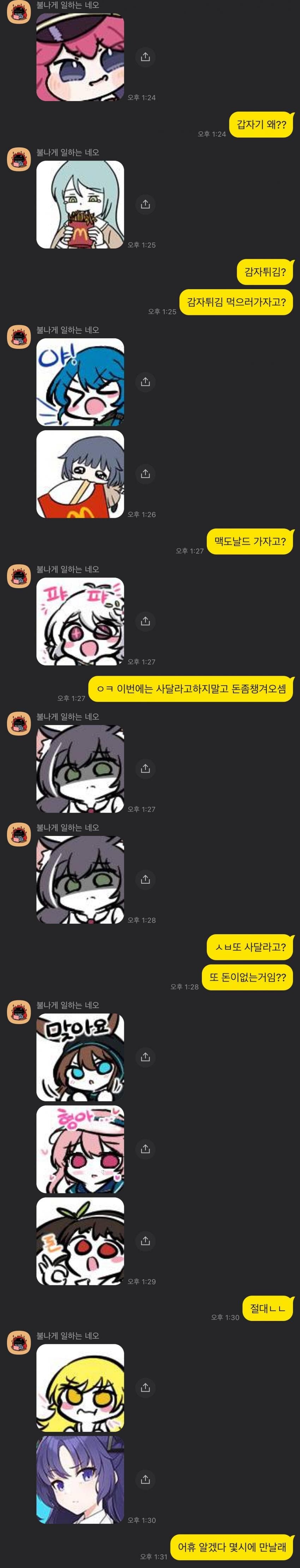 디시콘 그렇게 자주쓰면 나중에 언어장애생길수있음. 내 친구가 예전에 디시에서 디시콘 자주즐겨썼는데 한 며칠지나니까 애가 완전히 말도제대로 못하고 글도못쓰게됐고 글만 읽을수있어서 지금은 그 친구가 디시콘으로 나한테 의사전달을 하고있고있고 나는 한글로 대답해주는식으로 대화하고있음... 진짜 님들도 이렇게 되지않게 조심하셈. 알아보니까 디시콘 중독증이라고 치료법도없는 꽤 심각한 병이여서 지금 친구도 골머리를 앓는중임..