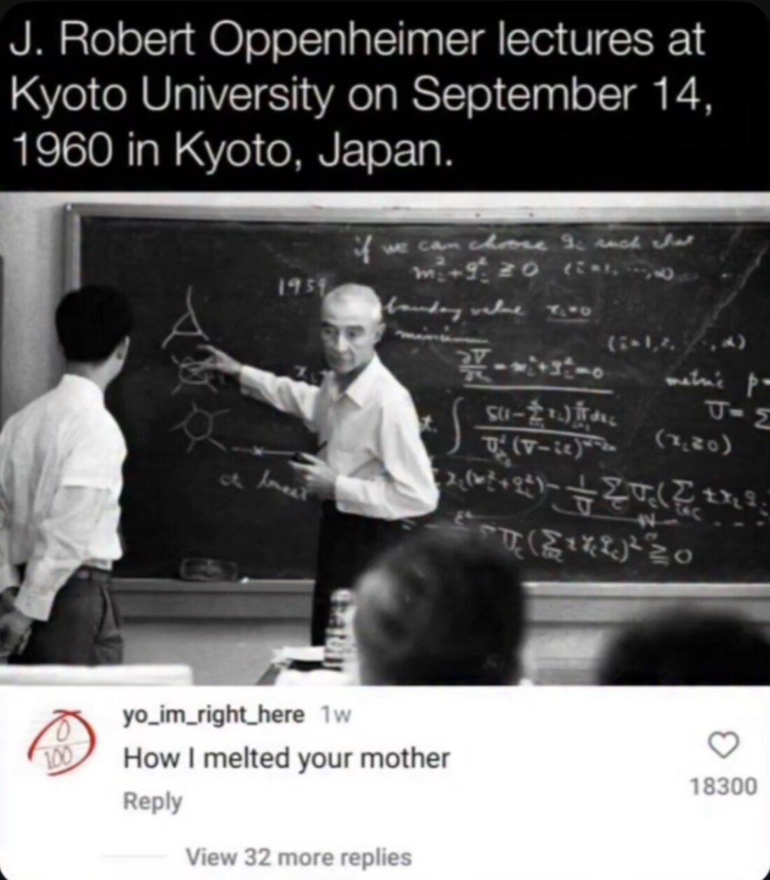 그것은 바로 미국. 일본의 교토대학에 기꺼이 강의를 하러간 핵폭탄의 아버지 J.로버트 오펜하이머. 본인의 제품을 사용한지 15년이 지난 국가에 찾아가 고객문의를 해주고 있다. 이양반 덕분에 일본의 연평균기온이 2000도 상승함.