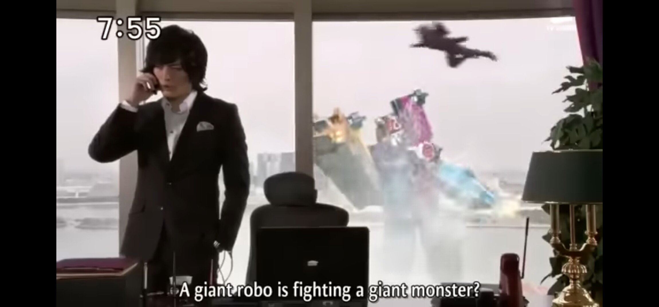 거대한 로봇이 커다란 괴수와 싸우고 있다고?