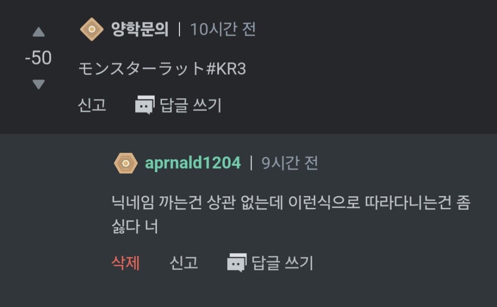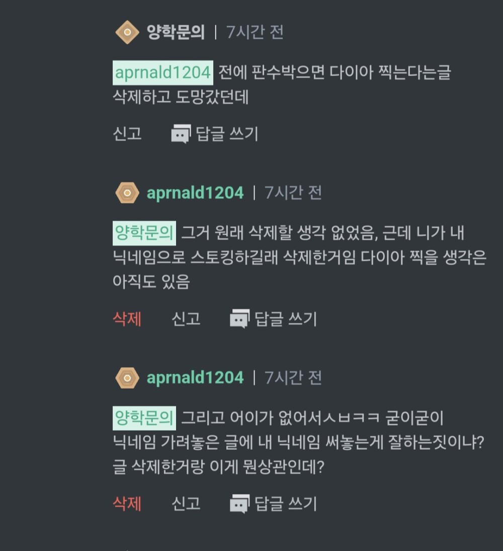 닉네임 가린채 게시물 올렸는데 닉네임 뿌리면 당황할줄 알았는지 저러고 있음