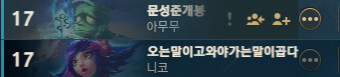 문성준개븅#KR1 오는말이고와야가는말이곱다#6267 칼바람인데 자야가 아무무한데 왜 양피지 가냐고 하니깐 두명이서 갑자기 갑자기 자야 부모욕을 하루종일함 진짜 말로 담을 수없는 욕도 많이함 제가 왠만하면 그냥 가는데 진짜 너무 심할정도로 욕해서 박제합니다
