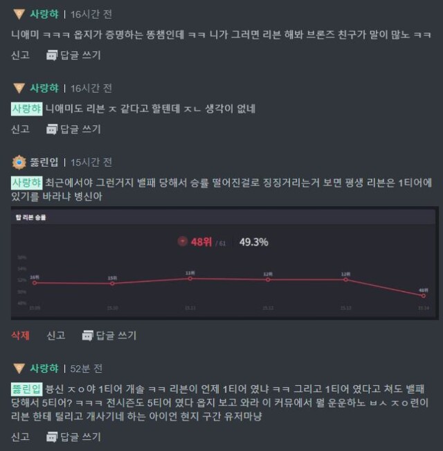 이 ㅈ병신 새끼는 답이 없네 최근에 2티어 정도 했으면 슬슬 4~5티어 한번 떨어질때 된거지 너프 먹고 티어 떨어졌다고 바로 징징거려놓고 너프 먹기전엔 괜찮았다 지적하니까 바로 패드립 박네 리슬람 새끼들이 아직도 살아있을줄 몰랐네 심지어 처음에 저 리븐약해요 징징글도 유저뉴스 게시판에 올렸음 갈리오햄이 옮긴건지 지금은 자유글에 있긴함